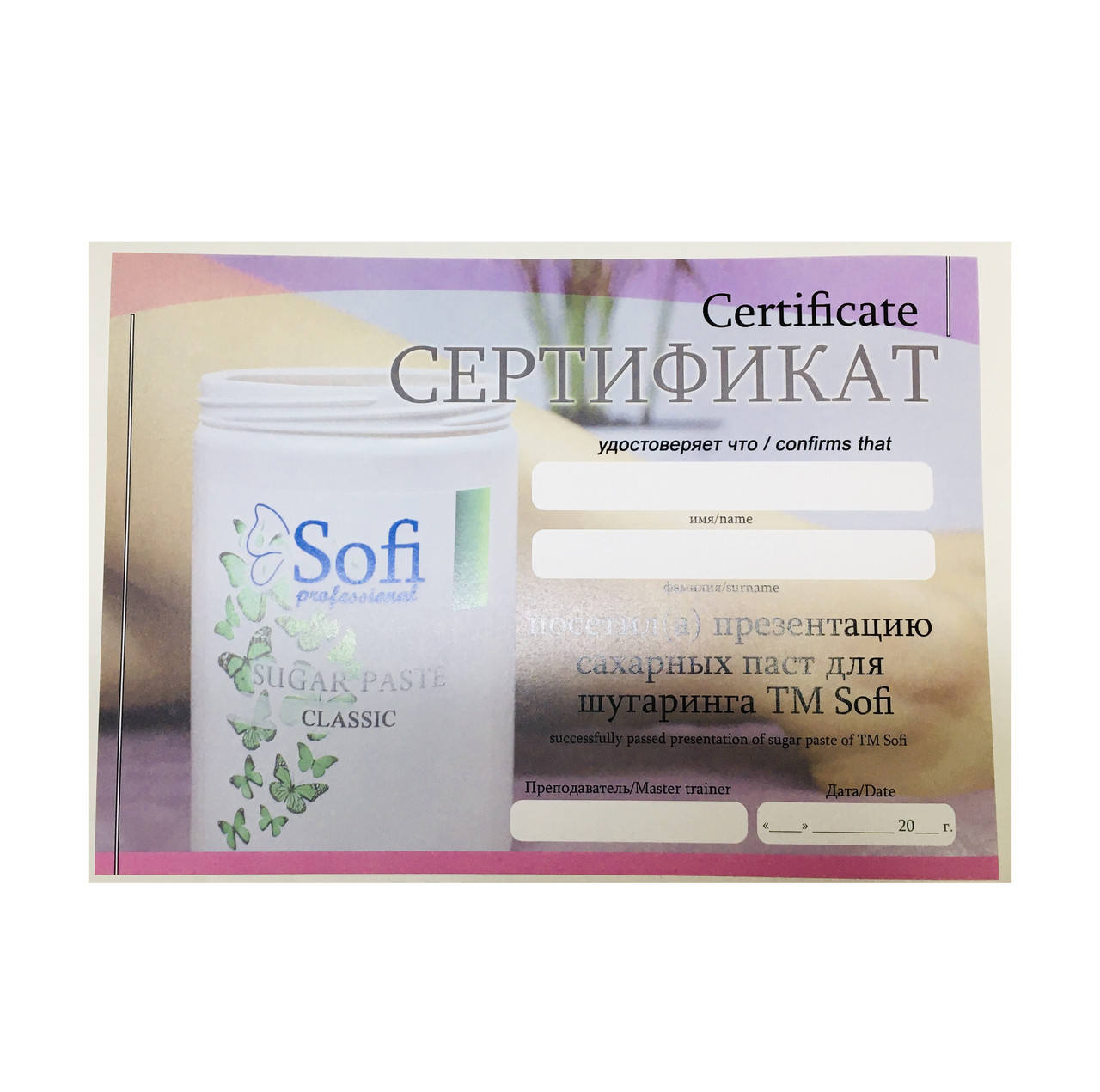 Сертифікат майстра шугарінга для Базового навчання Sofi May 10 штук (укр)Сертифікат майстра шугарінга для Базового навчання Sofi 10 штук (рос.)